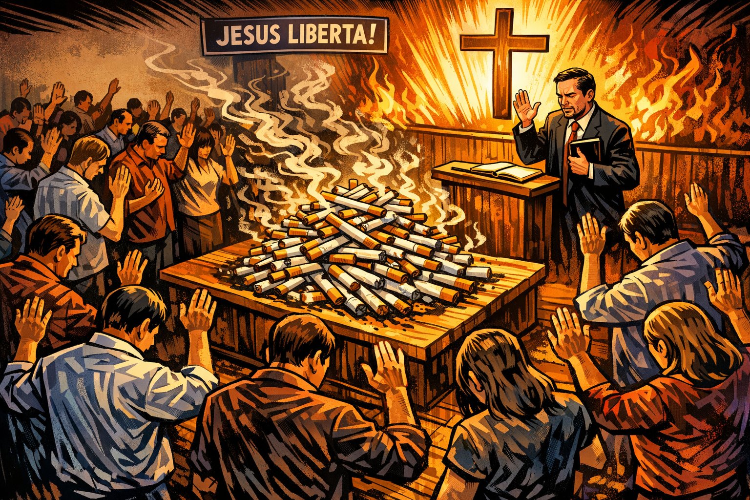 Durante o culto, o pastor chamou à frente todos os que fumavam. Pediu que levassem seus maços de cigarro ao altar. Disse que faria uma oração e que, a partir daquele dia, não fumariam mais. Ela ouviu aquilo e não acreditou. Para ela, parecia impossível. Fumava desde muito nova, por volta dos doze anos, e já carregava aquele vício havia mais de trinta e cinco anos, talvez quarenta. O cigarro fazia parte da sua vida. Ela gostava. Não queria parar. Não queria se entregar. Mesmo assim, ao seu lado havia um menino insistindo. O filho a cutucava o tempo todo, pedindo que fosse. “Vai, mãe. Vai, mãe.” Ela respondia que não adiantava, que se fosse à frente depois sairia dali e fumaria do mesmo jeito. Mas ele não desistia. Era a fé simples e insistente de uma criança.